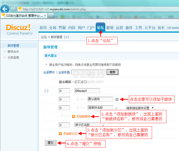 ,点击“论坛”,可以点击“添加新版块”和“添加新分区”进行添加,