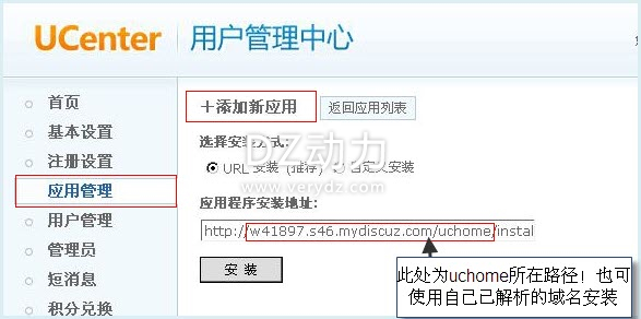 一、登陆Ucenter——>进入应用管理中心——>添加新应用——>填写安装链接