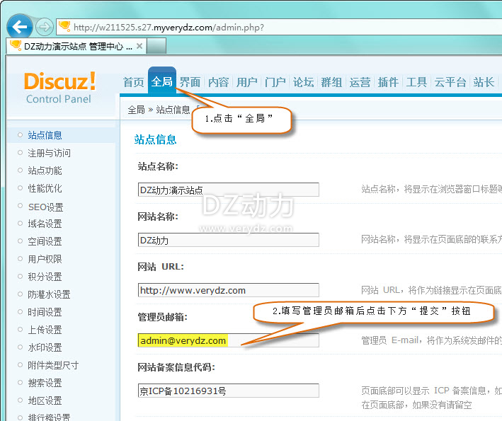 1.进入论坛后台,点击“全局”,修改“管理员邮箱”,把admin@admin.com 改成您的常用邮箱,