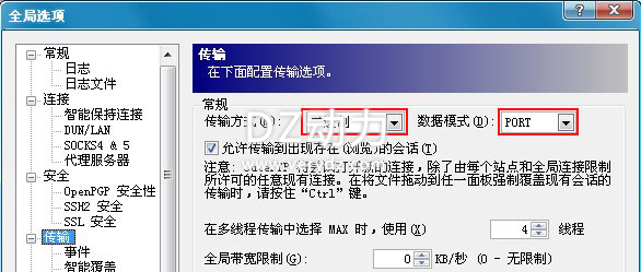 :在工具,全局选项,传输,数据模式这里选择PORT模式即可,传输方式推荐